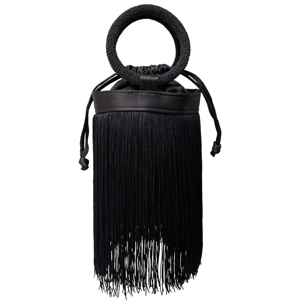 Bolsa de franja com formato estruturado cilíndrico, alça redonda trançada e fechamento estilo saquinho.