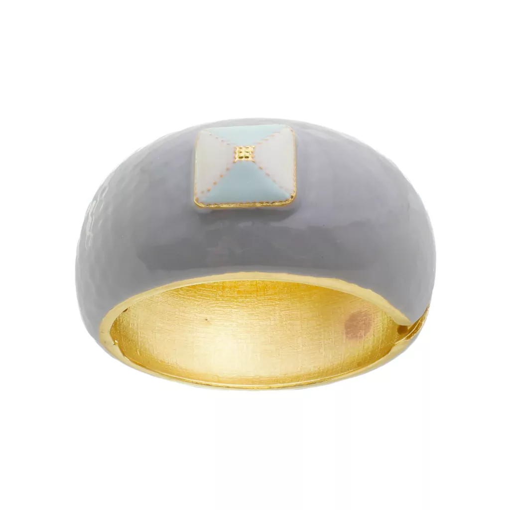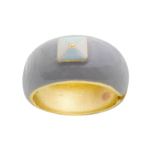 Bracelete de metal dourado na cor café claro com detalhe quadrado nas cores cinza, crú e verde água.