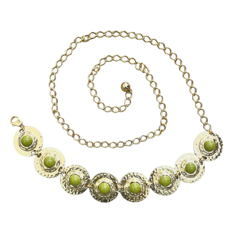 Cinto de corrente e medalhas douradas com pedra redonda na cor verde pistache.