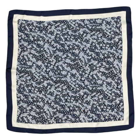 Lenço com estampa geometrica nas cores: preto, azul marinho e off white.