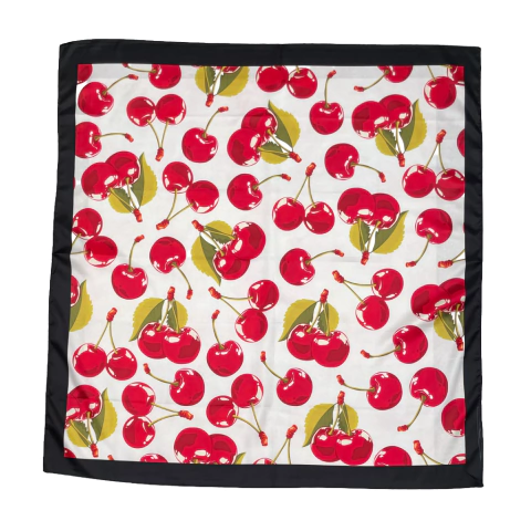 Lenço com estampa de cereja, fundo rosa e borda preta. Ideal para utilizar em várias ocasiões e de formas diferentes como no cabelo, pescoço, cintura ou pendurado na bolsa.